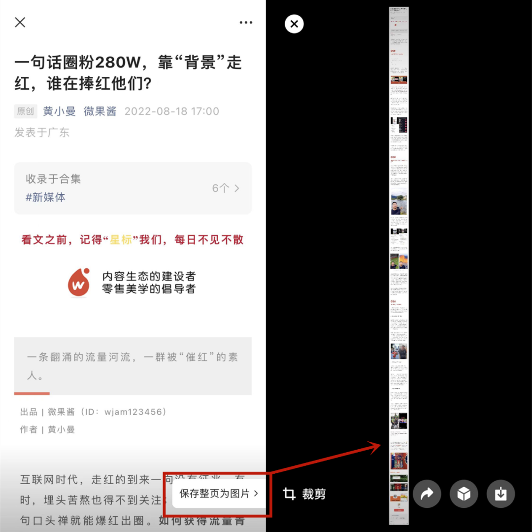 微信更新至最新版本后,截图公众号文章时,右下角将出现“保存整页为图片”的按钮,点击即可将整篇文章保存为一张长图,并能快捷进行裁剪、分享、收藏或下载等操作。