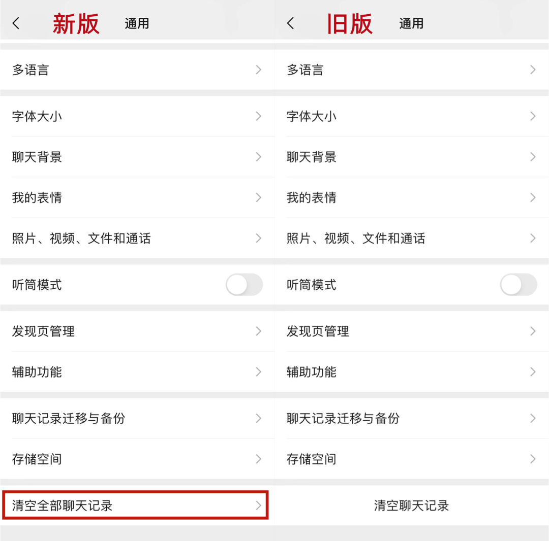 更新微信 8.0.27 for iOS 版本后,在“我-设置-通用”页面,原本在底部居中显示的“清空聊天记录”按钮变为“清空全部聊天记录”,并且左移对齐其他功能按钮。
