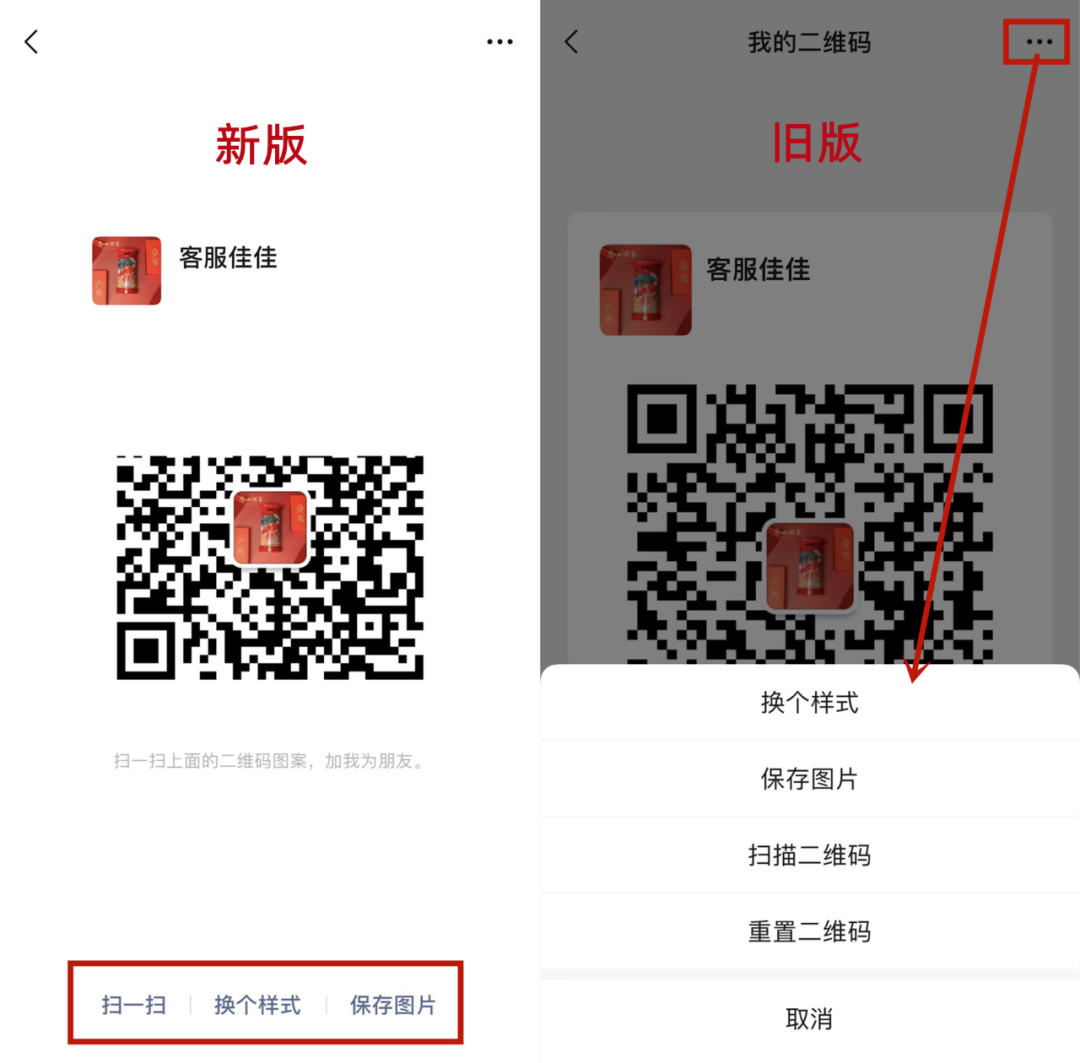 在更新后的微信 8.0.27 for iOS 版本中,个人二维码页面发生变化。原本需要点击右上角的“...”才能进行保存、扫描、换样式等操作,新版本微信将“扫一扫”“换个样式”“保存图片”三个功能置于页面下方单独显示。