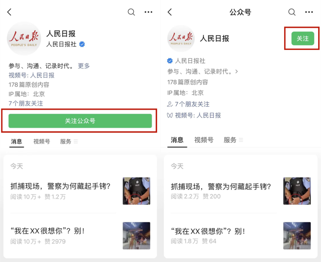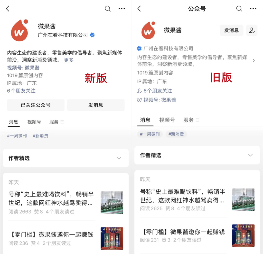 • “已关注公众号”“发消息”的按钮从右上角移至下方,并列居中显示,且调换位置;
