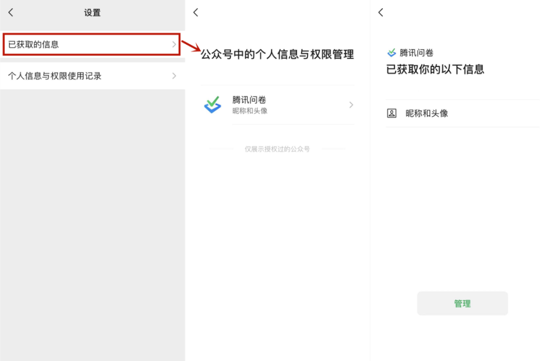 进入“个人信息与权限管理”页面,在“已获取的信息”模块可以查看授权过的公众号及其获取的信息内容;在“个人信息与权限使用记录”可以查看公众号的信息使用情况。