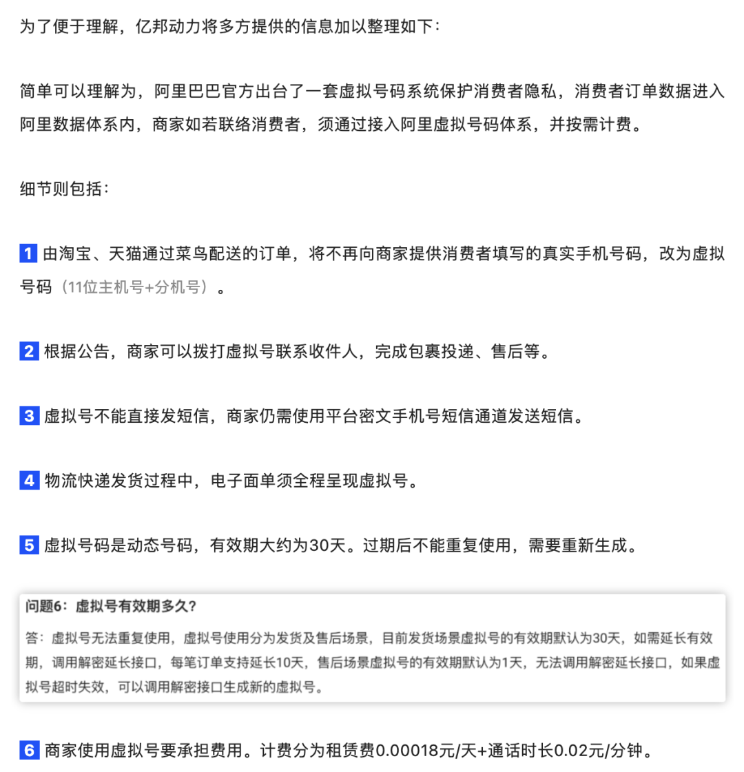据亿邦动力消息,为保护用户隐私,自9月1日起,阿里开放平台会迎来重要升级,将部分被隐藏字段的用户电话,直接替代为虚拟号码。