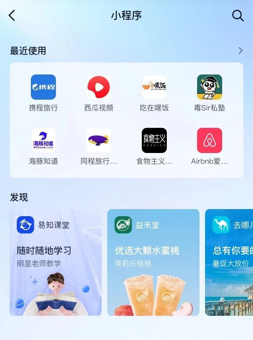 连线Insight发现,目前,在抖音首页,有一个“我的小程序”入口,可以看到自己经常关注的小程序,也可以看到类似于微信九宫格的固定小程序,包括益禾堂、易知课堂等商家。