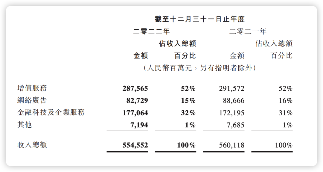 在2022年,该业务板块整体仍保持上涨,营收达到1771亿元,成为腾讯营收最多的一项业务,在整体收入的总占比也从2021年的31%上升到了2022年的32%,一度被外界视作腾讯增长的核心之一。