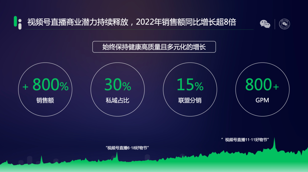 视频号2022年直播带货销售额同比增长了800%,私域在其中贡献占比30%。