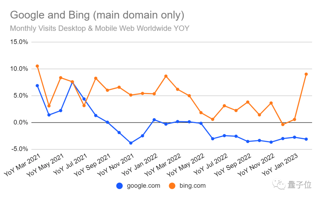 今年2月,必应宣布集成ChatGPT能力后,访问量增涨9%,与此同时谷歌下降了3.1%。