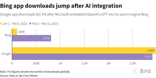 更显著的影响出现在移动端。根据data.ai统计,必应APP下载量猛增8倍,而谷歌APP下载量下降2%。