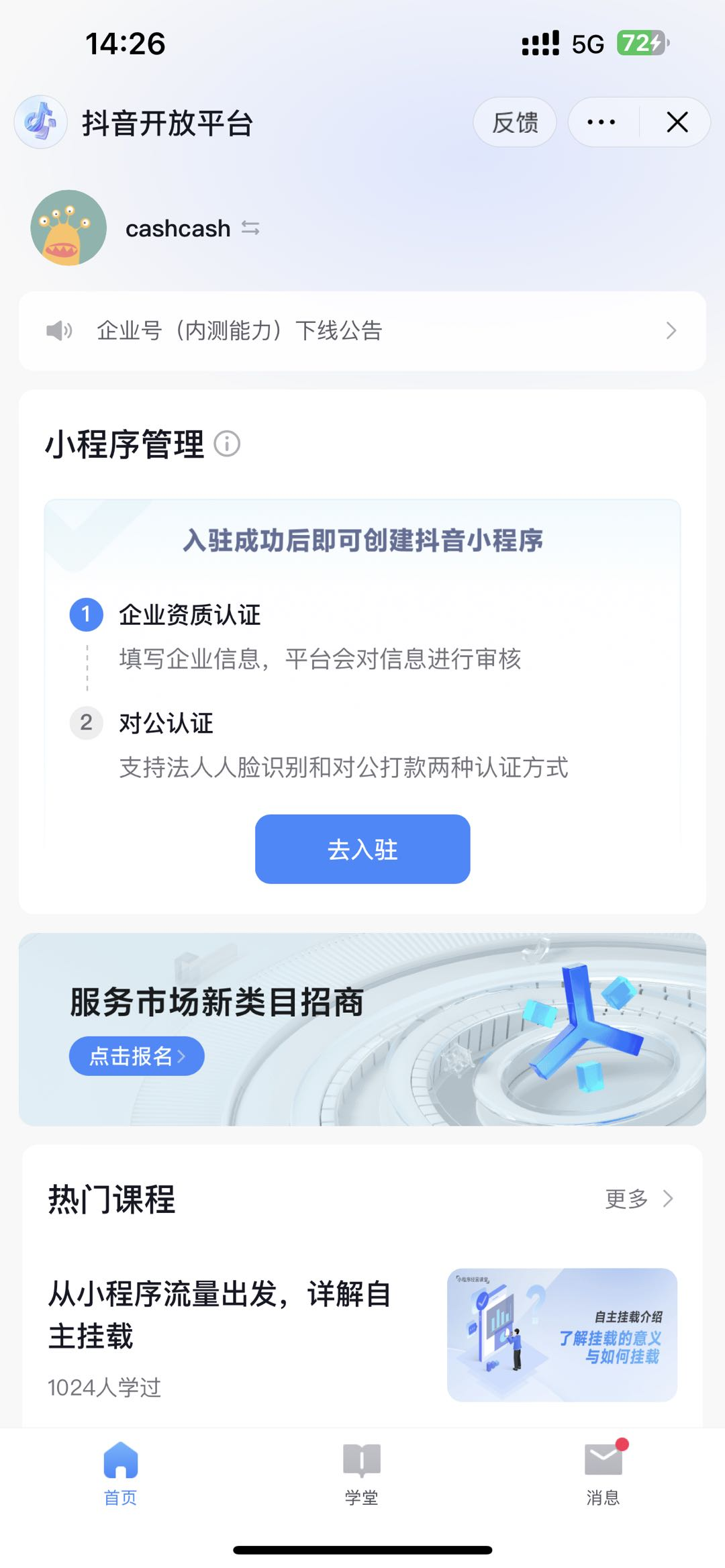 在抖音开放平台小程序内找到小程序管理,点击“去入驻”,按照小程序指示提交相应的认证材料和信息,就可快速完成入驻成为平台开发者。