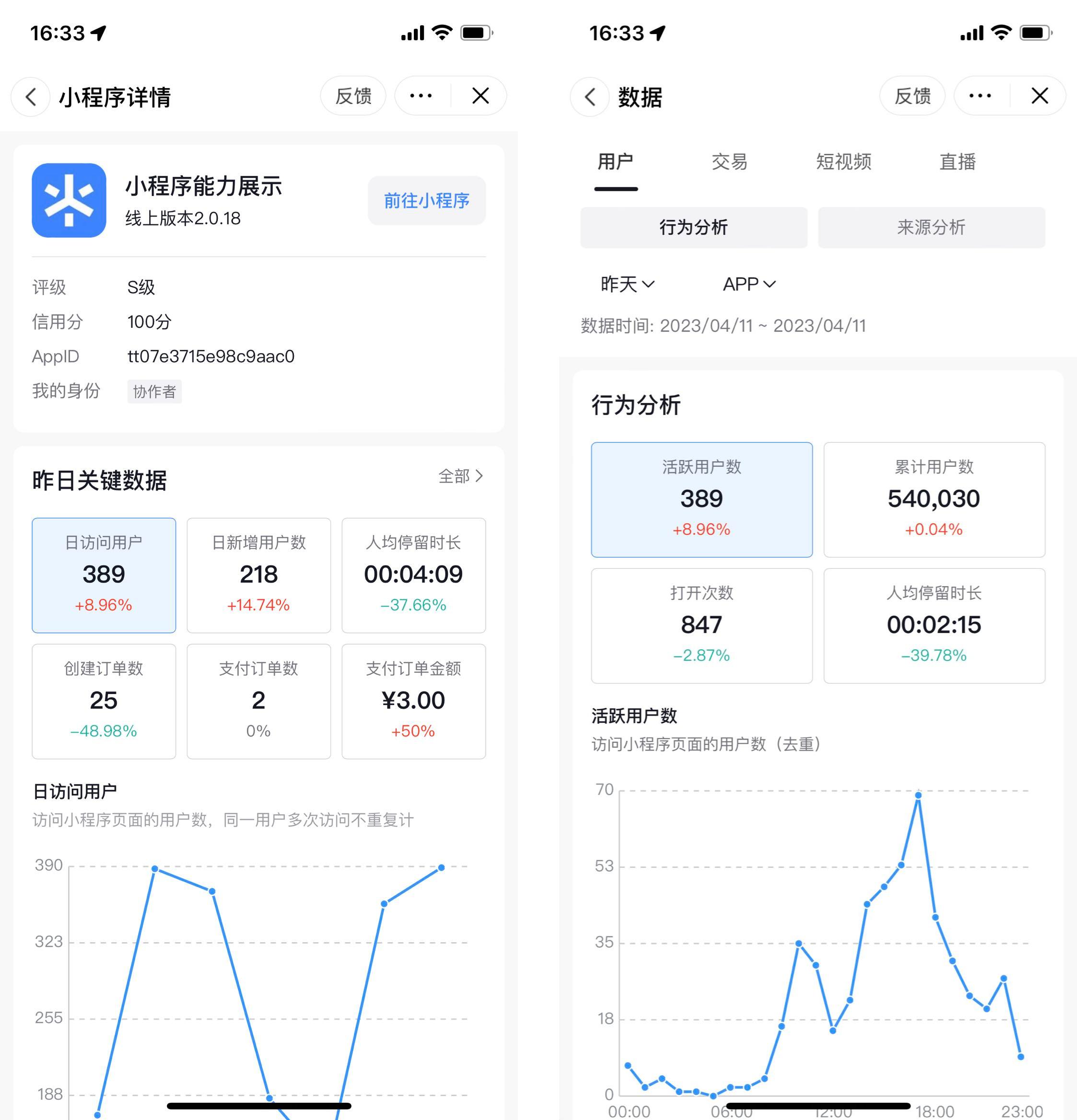 为方便开发者管理小程序,小程序提供了核心数据展示能力,对开发者所管理的小程序提供多个关键数据分析,随时随地掌握业务动态。