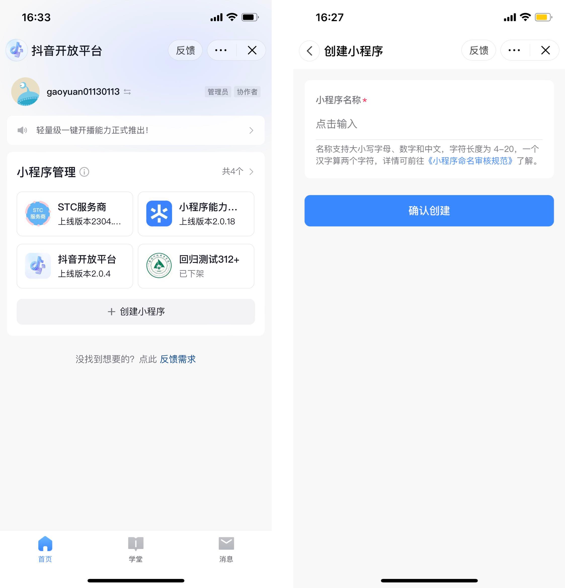 基于抖音丰富的场景,抖音开放平台致力于面向开发者提供创建、经营抖音小程序的全流程能力,满足大家在抖音上获客-留存-转化-复访-促活过程中的个性化业务需求。同时为广大开发者提供能力开放的应用生态,支持开发者自有的移动或网站应用接入抖音开放能力。为满足广大开发者经营需求,抖音开放平台正式上线官方微信小程序啦!