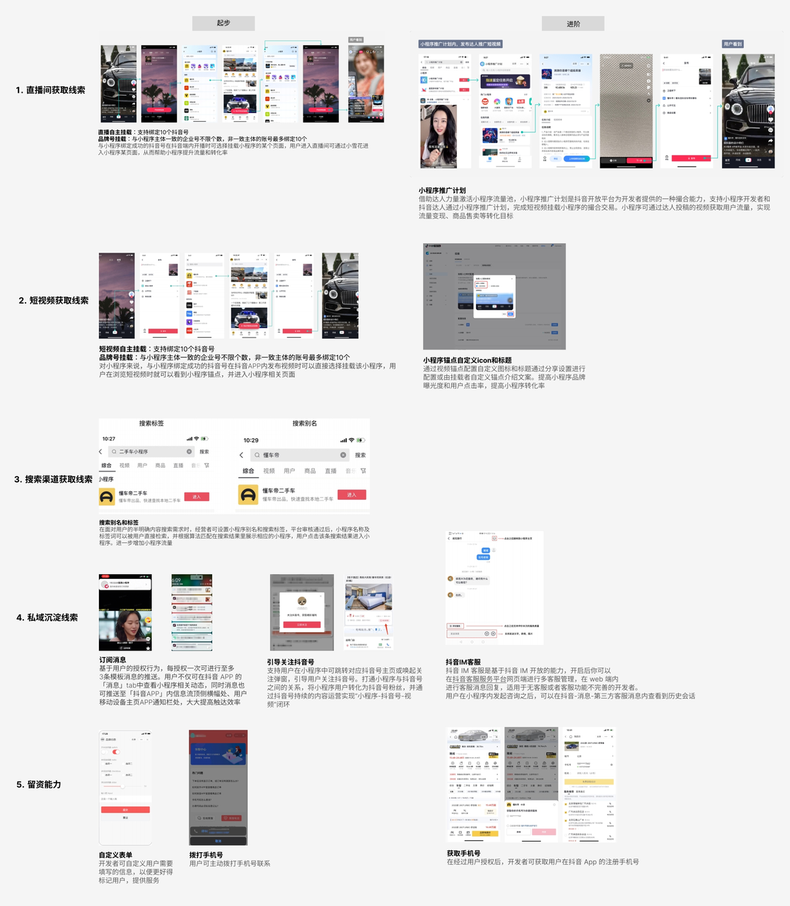 平台针对短视频、直播间两大获客渠道,提供多种公域流量转化到小程序;短视频自主挂载与直播挂载能力。