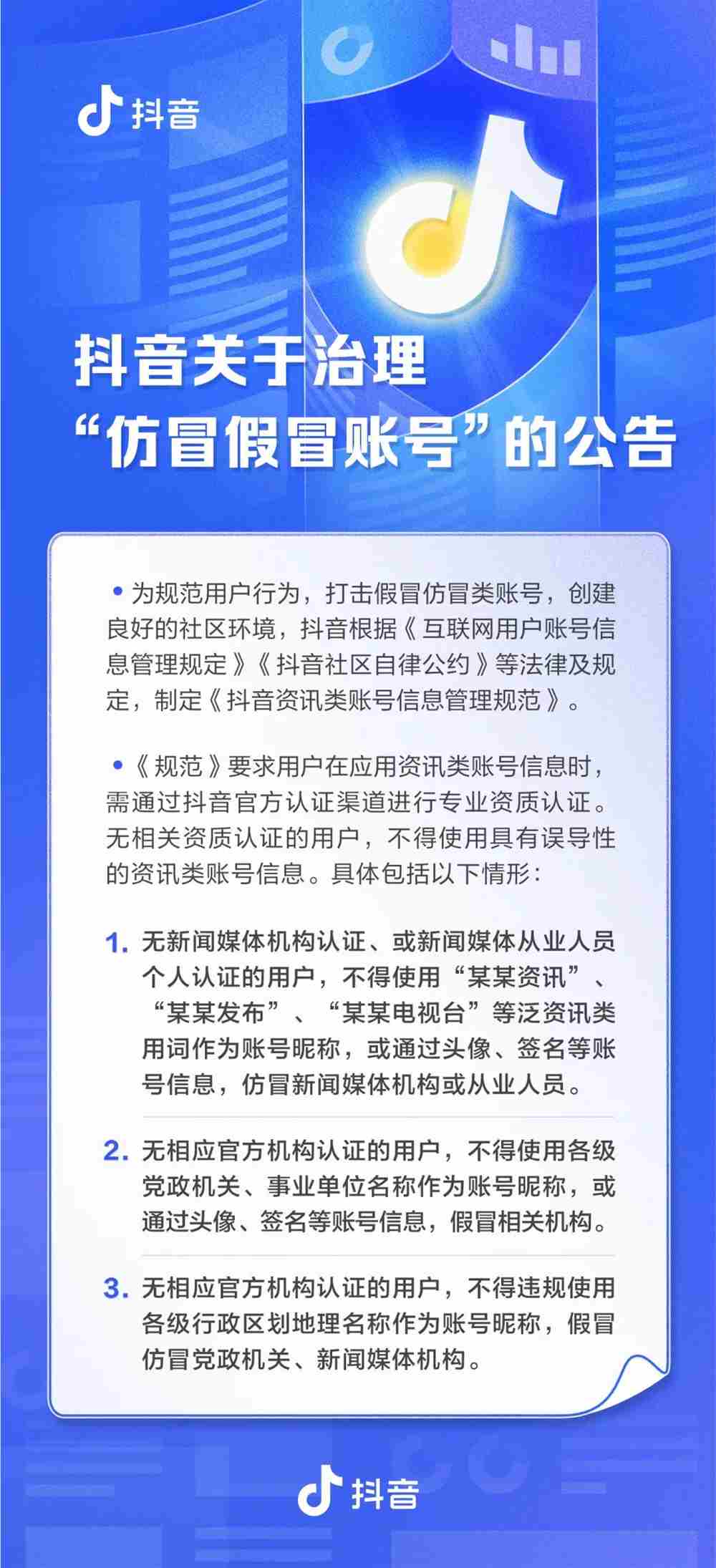 为规范用户行为,打击假冒仿冒类自媒体账号,抖音制定《抖音资讯类账号信息管理规范》。按照《规范》要求,用户在应用资讯类账号信息时,需通过抖音官方认证渠道进行专业资质认证。无相关资质认证的用户,不得使用具有误导性的资讯类账号信息。具体包括以下情形: