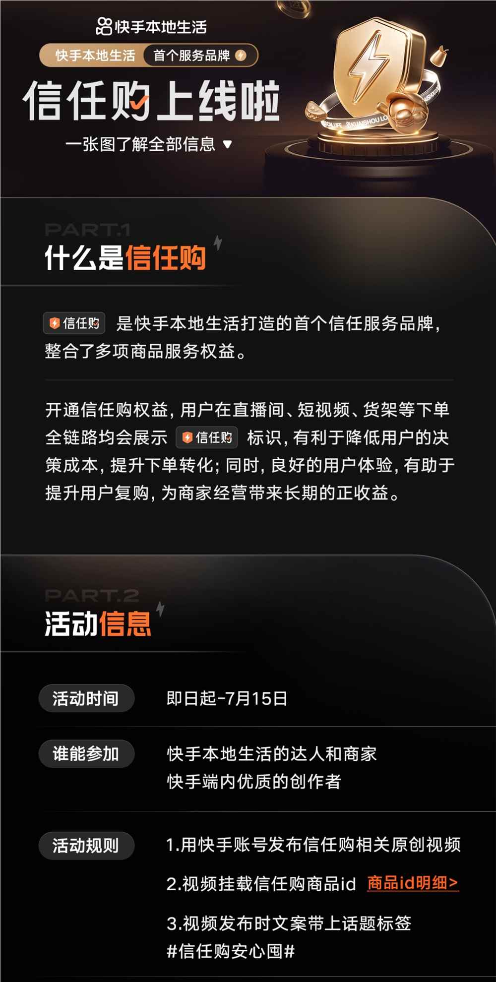 快手本地生活推出了首个服务品牌"信任购",旨在提供更可靠的购物体验。该品牌包括五大服务权益,分别是"随时可退"、"过期自动退"、"极速退款"、"免预约"和"周末节假日通用"。