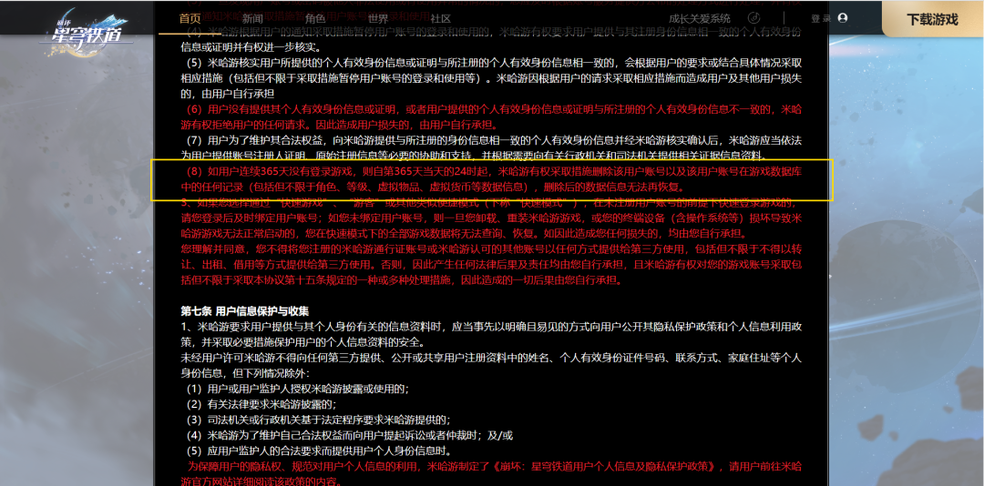 米哈游在《米哈游游戏许可及服务协议》声明,如果用户 365 天没有登录游戏,那么米哈游有权采取措施删除该用户账户和游戏信息。