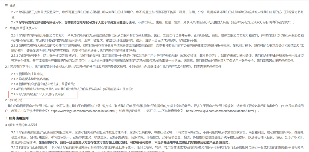 与优酷相比,爱奇艺的相关协议对平台更有利,除去主动申请注销和违反平台用户行为规范,连续 180 天未使用账号,爱奇艺有权收回账号。
