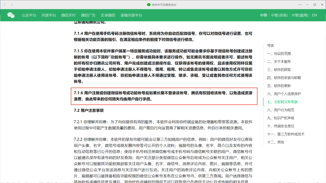 事实上,如果大家翻看微信的《软件许可及服务协议》,在 7.1.6 条款中,微信特别提及: