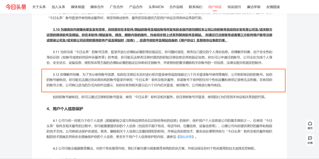 今日头条的协议中关于回收账号的模式与抖音相同,不过未登录时长可以更长。
