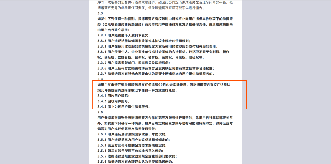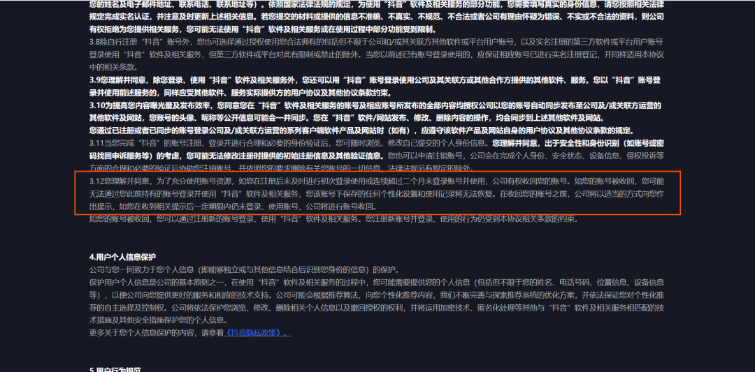 小编翻看了好几个平台的服务协议,事实上, 3 年在各个平台的服务协议中算比较长的时长了,毕竟最短的抖音,只有 2 个月。