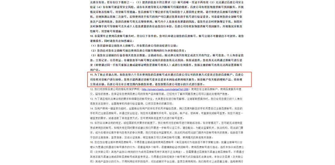 为了防止资源占用,如您连续六个月未使用您的百度帐号或未通过百度公司认可的其他方式登录过您的百度帐户,百度公司有权对该帐户进行回收,您将不能再通过该帐号登录名登录本网站或使用相关服务。
