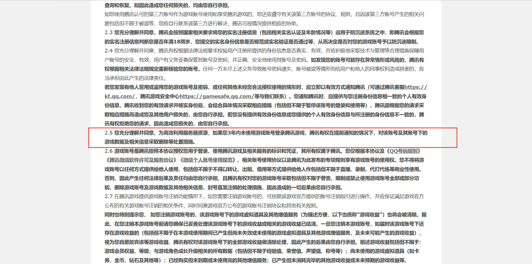 但是在 QQ 游戏的《游戏许可及服务协议》中,腾讯给出了长期未登录会没收账号的期限——3 年。