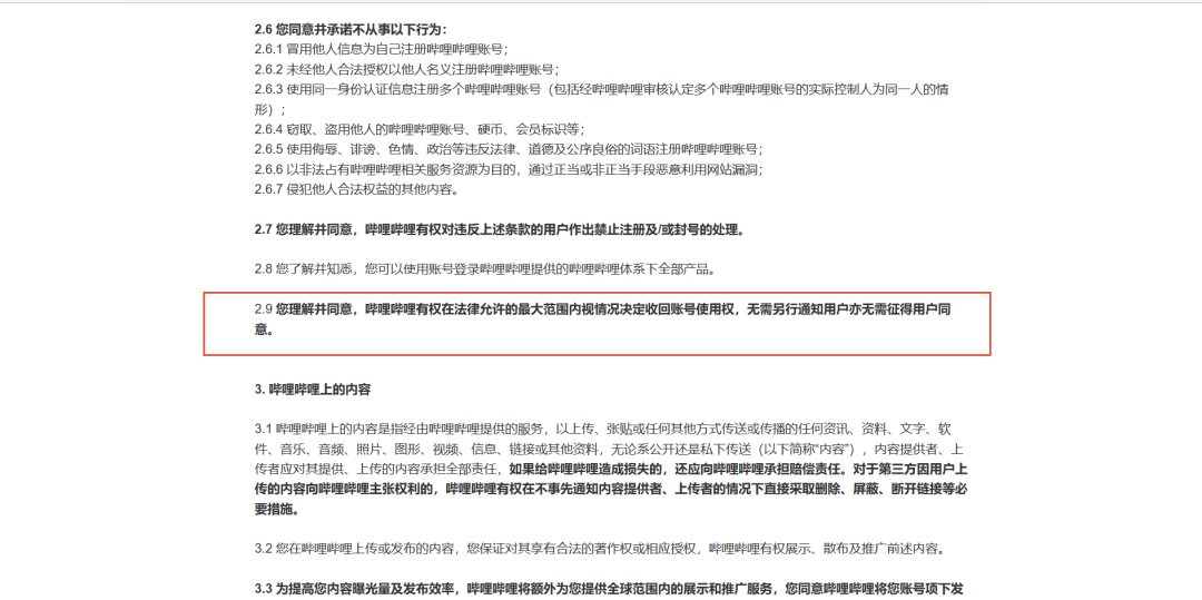 B 站的账号回收条款比较模糊,仅以“法律允许的最大范围内视情况决定”,同时也无需通知用户,这样的解释对平台很有利,但对用户不友好。