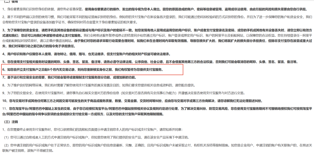 如您自开立支付宝账户之日起 6 个月内无交易记录,则向您重新核实身份之前,我们有权暂停为您提供支付宝服务。