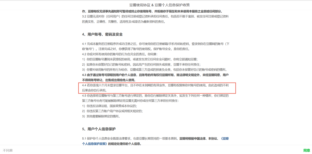 豆瓣条款比较短,且内容中没有提“收回账号”,而是“限制你对账号的使用”。